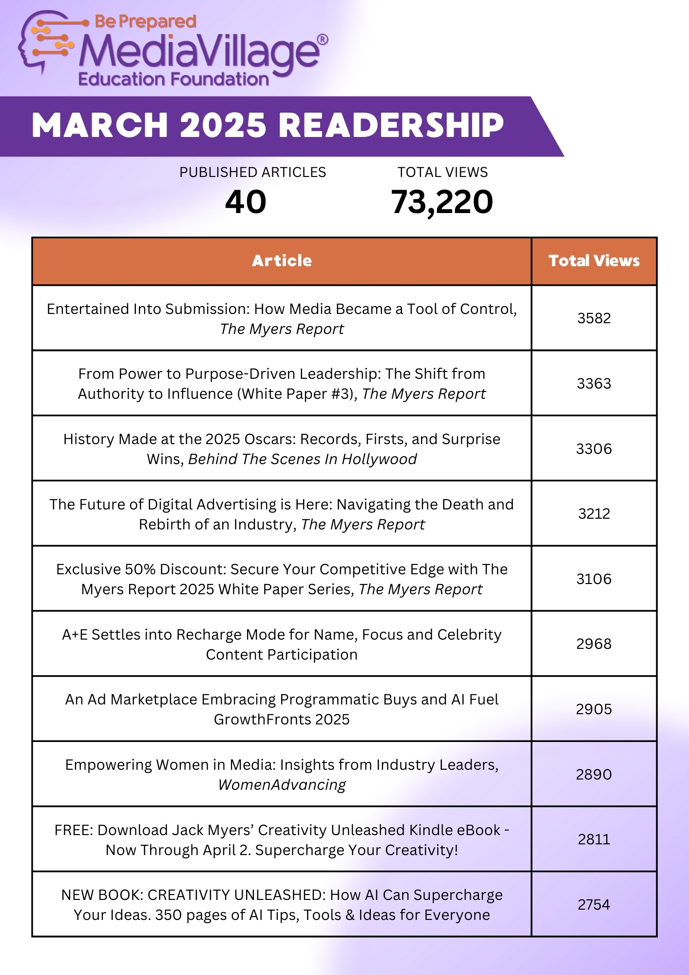 From the Academy Awards and Newfronts to book launches and the latest White Papers from The Myers Report, March was certainly a busy month. Entertained Into Submission: How Media Became a Tool of Control took the top spot with over 3,500 readers. “The parallels between the media landscape of today and these cautionary visions are inescapable,” writes Jack Myers, reflecting on the vast changes in media since the days of Neil Postman and Marshall McLuhan.