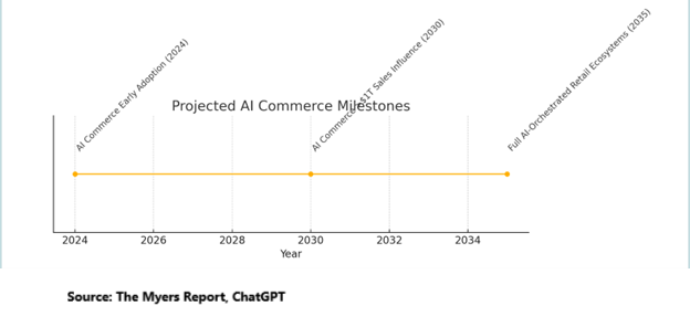 If adoption follows AI’s early trajectory, AI-driven commerce could surpass $1 trillion in annual sales influence within a decade. Retail media, already a $63 billion market in the U.S., (See The Myers Report on Retail Media) will evolve into AI media, where product recommendations are no longer based solely on search keywords or demographics, but on multi-dimensional behavioral, contextual, and emotional data.