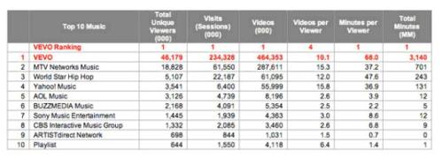 Recognizing the audience size, the two largest record labels (Universal and Sony- which together account for more than half of global sales), created a joint venture with YouTube called VeVo. In less than six months, VeVo became a top 15 US internet site and the #2 US online video destination with more than 50 million unique visitors. Most importantly, by selling advertising directly to brands and advertising agencies, VeVo earns CPM's (cost per thousand advertising impressions) of $25 and more, compared to the $5-$8 they had been receiving from YouTube. VeVo CEO Rio Caraeff, speaking at the NewTeeVee Conference last month said, "music has not been treated as a premium opportunity online. We believe music videos online shouldn't be treated any differently than a season premiere of Grey's Anatomy."