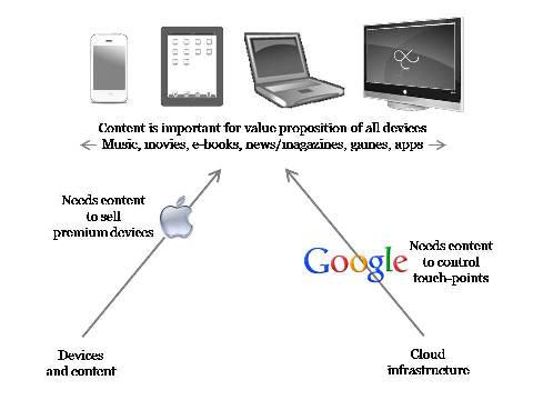 Apple and Google (www.google.com) turned the mobile industry on its head by creating vibrant product ecosystems- encompassing devices, content and on-line services. The Apple ecosystem is optimized for a premium user experience, delivered via iconic devices sold at premium prices. In contrast, Google's ecosystem is optimized to maximize the number of people accessing Google's ad-supported services via a variety of devices. Both Apple and Google must expand their experience ecosystems across screens, shifting the battleground from Smartphones to tablets and finally the living room. The outcome of this competitive struggle will be decided by how successfully they can offer a wide selection of content across all devices. This includes music, premium video, e-books, magazines, games and applications. Both companies need content licensing deals with cloud infrastructure to make the content available across all connected devices. Apple dominates content, while Google leads incloud infrastructure. Apple will build on its content strengths while investing heavily in cloud services. The recently announced iCloud service is the first move in this direction. The service detachesiTunes content delivery from PC dependency- helping to consolidate the product experience of iPhone,iPad, Mac and Apple TV. Google owns the more robust cloud infrastructure but does not match Apple in content. Google will invest in securing big content deals and strengthening content delivery services for Smartphones, tablets and connected TV. This includes partnerships with music video site Vevo (www.vevo.com), Google TV and the nascent Google Music (http://music.google.com/music) and Google Movies. Console game platforms (Sony (www.sony.com), Microsoft (www.microsoft.com), Nintendo (www.nintendo.com) are still leaders in living-room entertainment- but on the defensive. This is due to fragmented product experiences that are particularly weak on Smartphones and tablets. While Microsoft and Sony will continue to close these gaps, they won't challenge the leadership of Apple and Google in mobile devices.