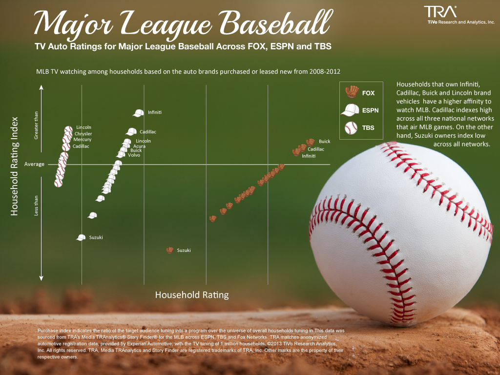 In the spirit of baseball’s long-time romance with statistics, TiVo Research and Analytics, Inc. (TRA) used its unique access to over a million anonymized, single-source households that are matched based on their TV tune in behaviors and the cars they own (auto registration data provided by Experian Automotive). TRA looked at all three networks that air Major League Baseball and created TV-Auto Ratings reports for each. When looking across households that watch MLB on all three networks, a few major auto brands stand out among the rest. For the sport that has been tapped as America’s favorite past time, a favorite American auto brand, Cadilllac, hits a triple by over indexes across all three networks. Also of worthy note, MLB watchers are driving Infiniti, Buick and Lincoln brands. On the other hand, Suzuki owners are less inclined to watch MLB.