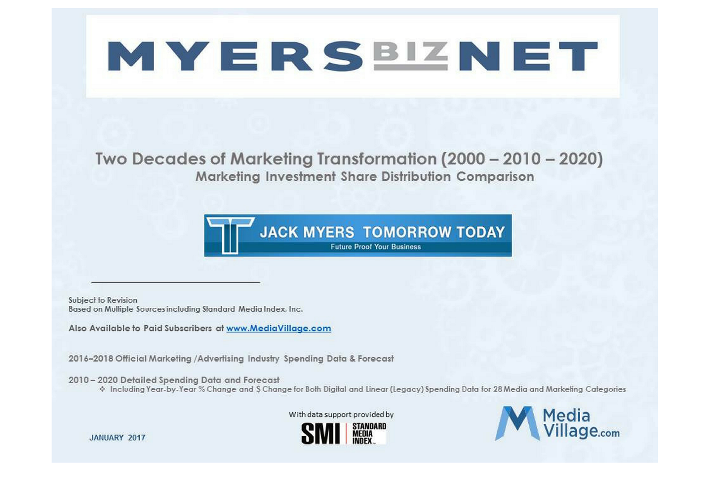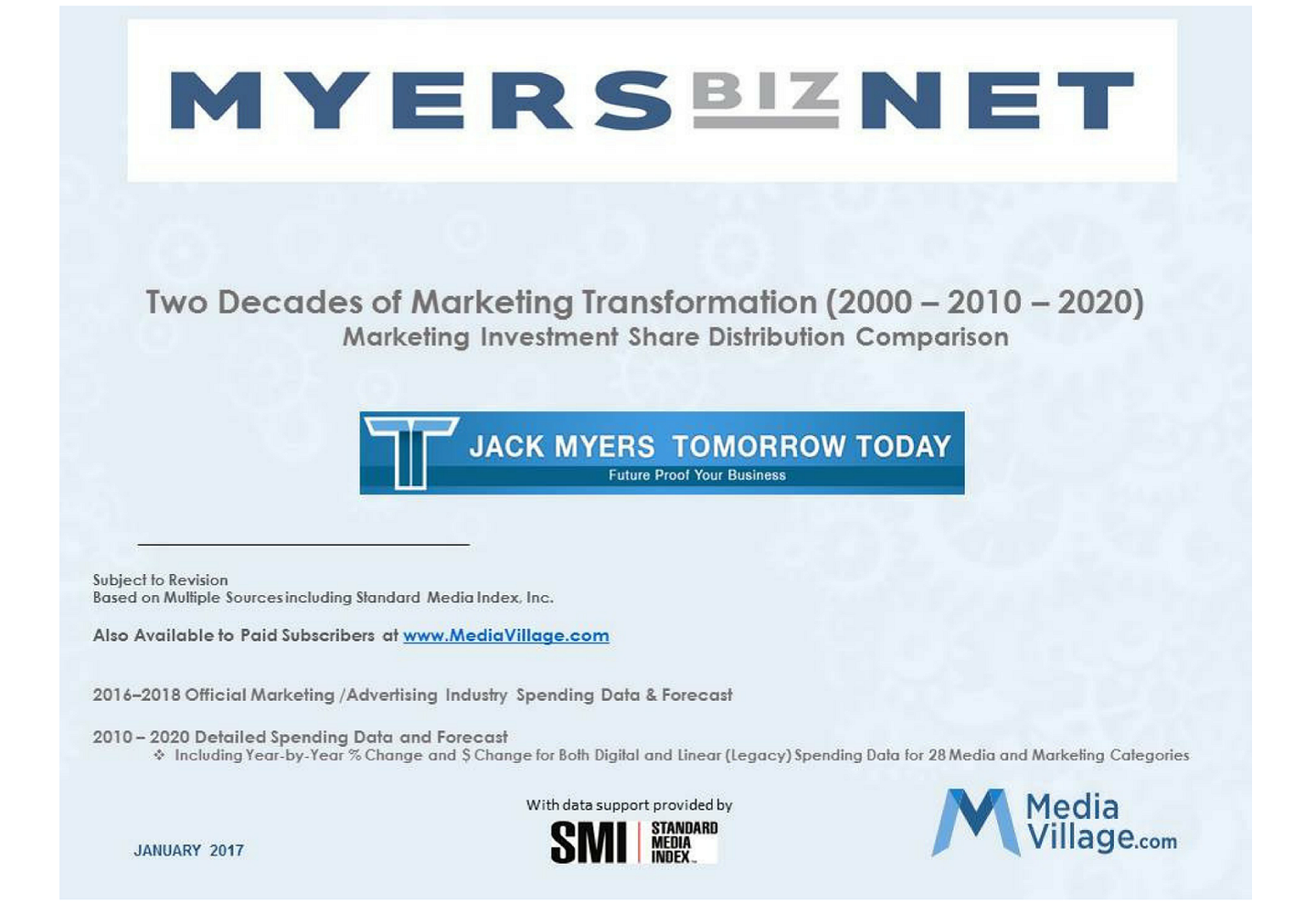 Between 2000 and 2020, total U.S. marketing communications investments will have grown a scant 1.9% from $544.8 billion to $586.7 billion, according to a new economic report issued today on 28 above and below-the-line media and marketing categories by MyersBizNet. (The full report is available to MyersBizNet paid member companies at www.mediavillage.com.) During the two-decade span, above-the-line media (aka “advertising”) is projected to increase its share of total marketing investments from 28% to nearly 40%, with virtually all growth resulting from a shift of below-the-line budgets (aka “shopper marketing” or “promotion”), which are projected to decline almost 16% from $390.4 billion in 2000 to $355 billion in 2020 (SEE CHART BELOW). During that same period, media advertising budgets are projected by MyersBizNet to increase more than 50% from $154 billion to $232 billion. The MyersBizNet report (download it below) includes 2020/2010/2020 data and forecasts for both legacy/linear and digital investments in 28 media and marketing categories. A separate MyersBizNet economic report projecting 2017 and 2018 marketing and media investments by category is also available to paid subscribers here.