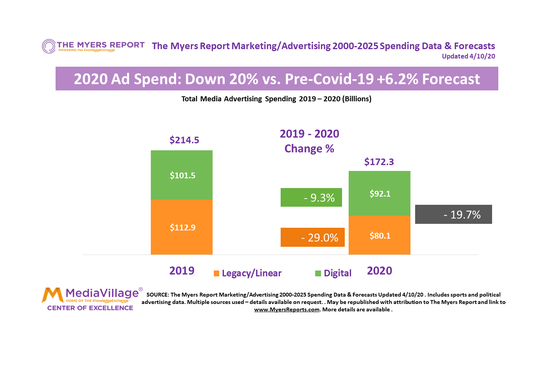 The Myers Report released new data last week on the state of the media and advertising economy, reflecting the anticipated impact of COVID-19 and the resulting economic downturn. Our forecasts are more bearish on 2020 ad spending and, unlike other forecasters we're projecting a long economic recovery pattern that will continue to be reflected by a local, regional, and national advertising recession. The Myers Report does not expect total advertising investments to return until 2024/2025 to 2019's $215 billion. We forecast declines of 20% in 2020 followed by increases in 2021 and 2022 of only 8% annually, bringing 2022 ad spending only to $202 billion. For insights and more details on our forecasts scroll down and you can view my economic conversation with analyst Michael Nathanson of MoffettNathanson here.