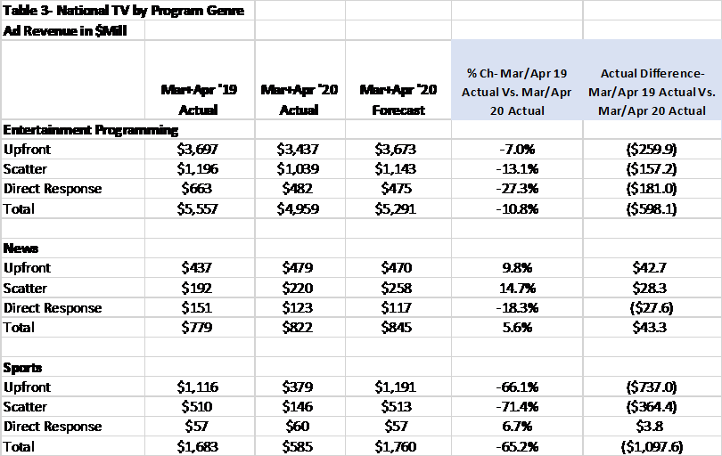 Because of the lack of sports programming, broadcast actually witnessed greater declines for both Upfront and scatter spending than cable (see Table 2), especially for Upfront spending. And the greater decline for broadcast is a reverse of January/February, leading to broadcast being down $700 million from last year and $800 million from forecast. Cable is down $900 million from last year, but only $700 million from forecast. Syndication is actually outperforming both March/April 2019 and SMI's March/April 2020 Forecast.
