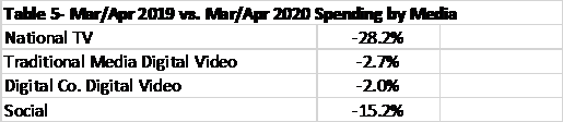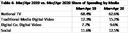 From a share perspective, March/April witnessed a material change in share for digital video from digitally centric companies and social (see Table 6). They now command a combined 22% share of national media spend, up 3 points from 2019. And while spending on digital video from traditional media companies grew slightly, that growth wasn't enough to offset the decline in linear TV spending.