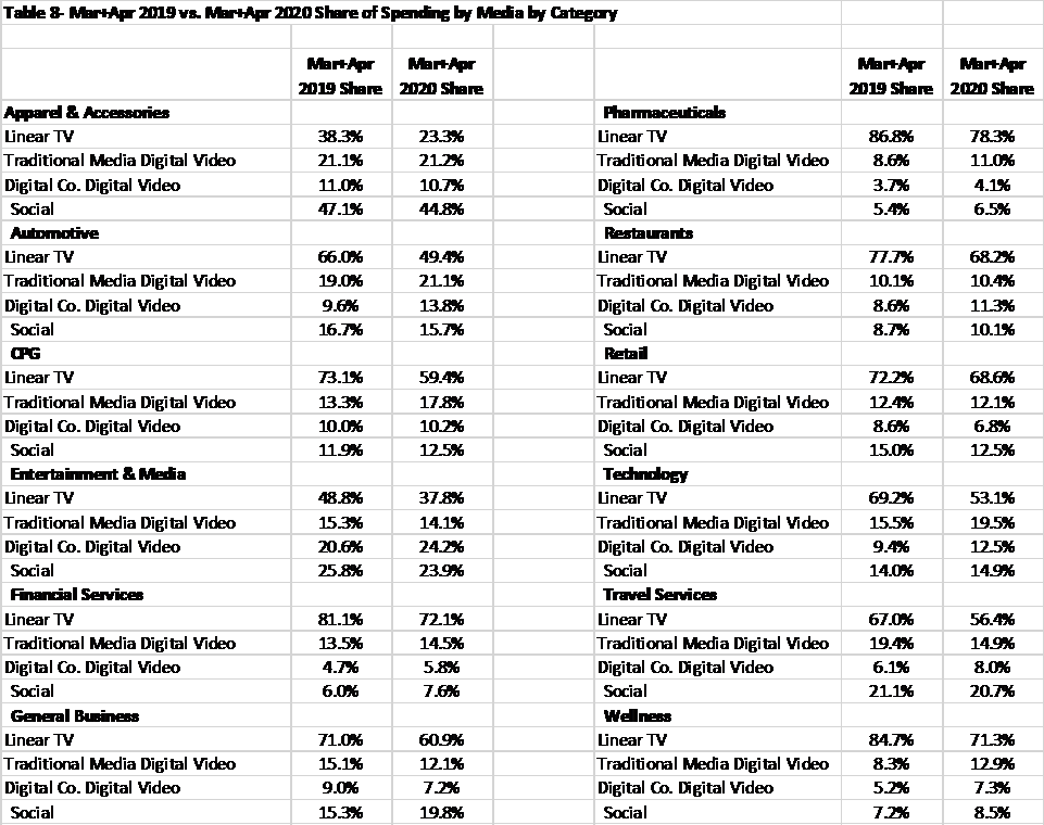 The decline in spending across traditional, digital video and social among national advertisers was widespread across all categories except CPG, Entertainment & Media and Pharma, who actually increased their spending (see Table 7). Three categories- Auto, Restaurants and Retail- account for nearly 50% of the declines.