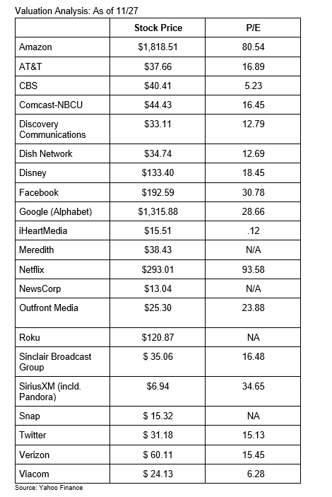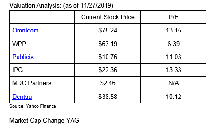 Insights from Q3 2019 reflect the views immediately prior to the start of what will likely be a tectonic shift in the media industry with the roll-out of several high-profile direct to consumer over-the-top plays. AppleTV+ and Disney+ have rolled out with several other high-profile players, including NBCU’s Peacock and AT&T’s HBO Max, in the coming months. Disney+ has surpassed expectations with over 24MM subscribers reportedly signed up as of this week. The impact of this unprecedented time is a recurring theme throughout the calls. General economic conditions also play a recurring theme with varying degrees of opinions as to whether or not 2020 will be a slowdown. In the agency world, the topics of in-housing and progress in both data platforms and client development continue to be the focus.