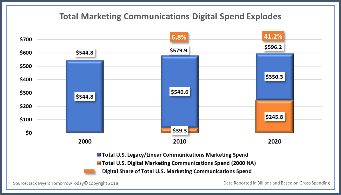 The story of two decades of marketing communications change is, in a word, digital. Between 2000 and 2010, annual legacy/linear marketing communications spend declined by $4 billion while annual digital marketing communications spend grew to $39.3 billion: 6.8% of total U.S. marketing communications spend. Jack Myers TomorrowToday forecasts that, between 2010 and 2020, annual total marketing communications legacy/linear spend will decline by $190 billion. Annual digital marketing communications spend is expected to reach $245.8 billion by 2020: 41.2% of total U.S. marketing communications spend. By 2021, digital marketing communications spend is expected to represent 50% of total U.S. marketing communications spend.