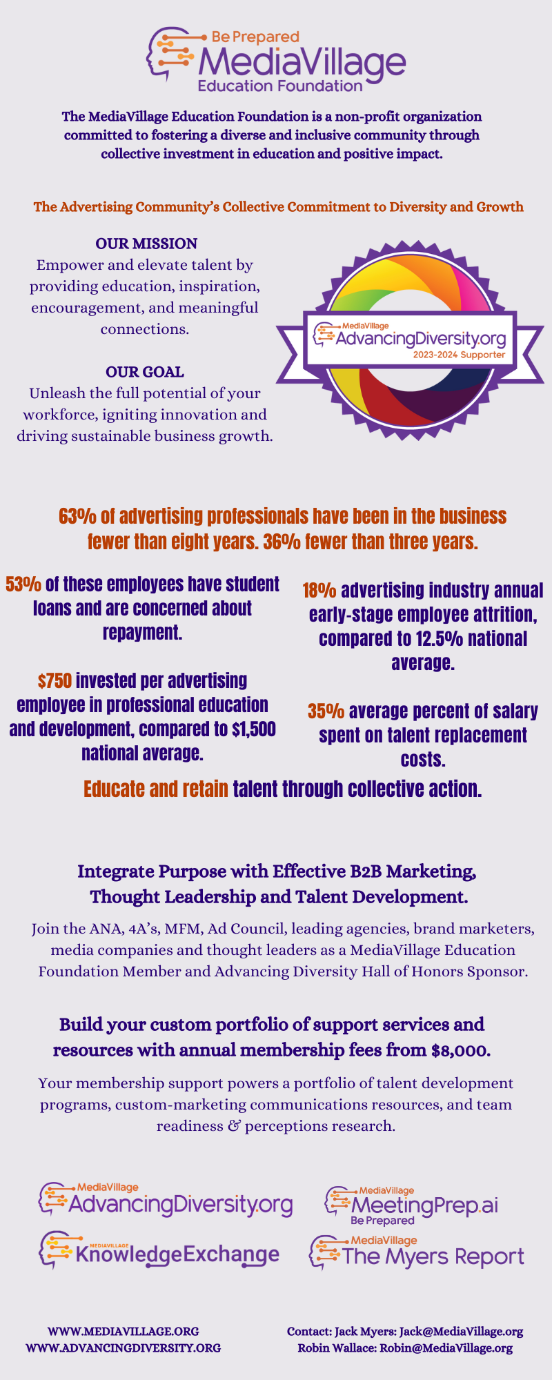 Your investment in MediaVillage isn't just a decision -- it's a declaration. It underscores that you recognize the intrinsic value of nurturing and preparing your team for the challenges ahead. It's a reflection of foresight and sound management. Conversely, a reluctance or failure to invest adequately in team development isn't just an oversight -- it's a gap in management and fiscal responsibility. You wouldn't run a machine without proper maintenance; why treat your team any differently? MediaVillage not only elevates talent but does so within established budget parameters. It's where prudent financial planning meets impeccable talent strategy. Invest wisely. Invest in the future. Invest in the MediaVillage Education Foundation.