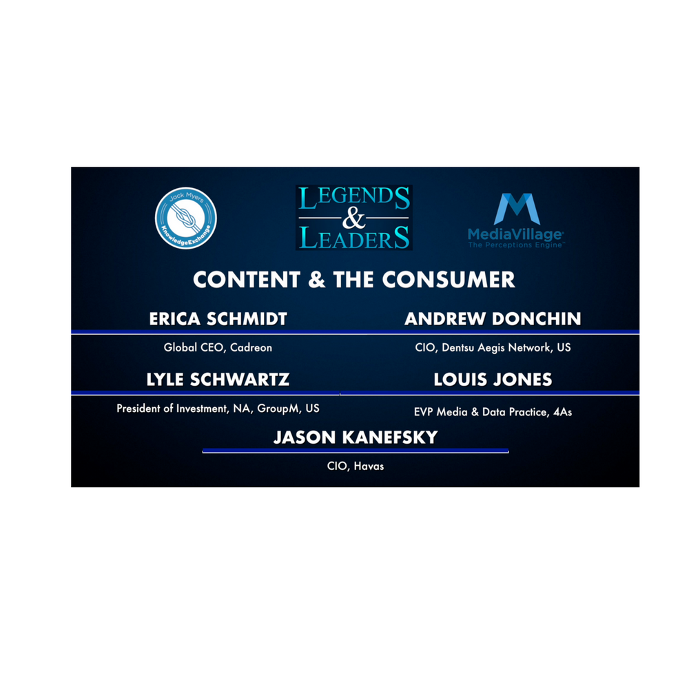 Joining Jack Myers for the second year of the Legends & Leaders Video Series were Erica Schmidt, Global CEO, Cadreon, Lyle Schwartz, President of Investment, NA, GroupM US, Andrew Donchin, CIO, Dentsu Aegis Network, US, Louis Jones, EVP Media & Data Practice, 4As, and Jason Kanefsky, CIO, Havas. These senior executives joined Jack for a round table discussion about the forces impacting the media, marketing and advertising industries today. See the interview above. Watch the full series here.