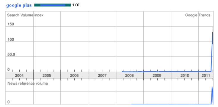 Let's take a look at how search volume for Facebook and Google+ compares. After no or little search volume for Facebook for about three years, it started to grow incrementally in mid-2008. But look at Google+, which opened in beta a couple weeks ago. Search traffic has skyrocketed.