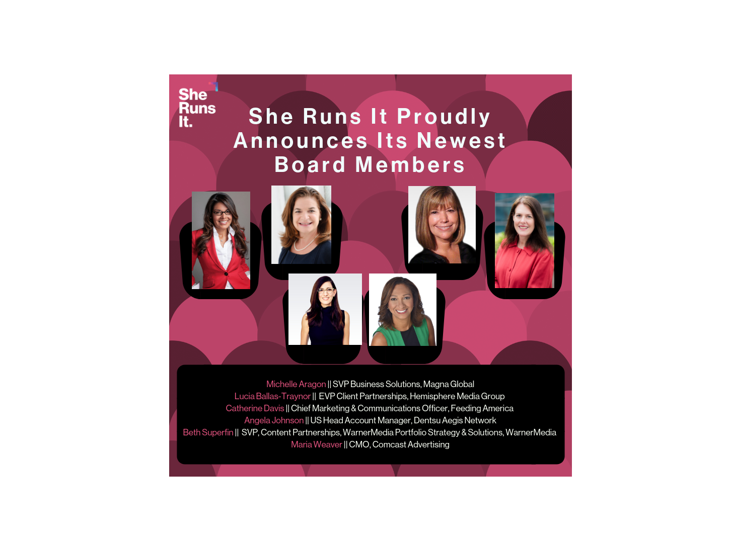 Describing her inspiration and goals for her tenure on the board, Angela Johnson of Dentsu Aegis explained: “I have always been a firm believer in the saying, ‘We women should lift as we rise,’ and have tried throughout my career to follow that goal. Joining the board of She Runs It provides an amazing platform to continue and expand that mission. Its diversity of members, geographical footprint (now expanding to the West Coast) and the breadth of topics it tackles does so much to deliver its mission of helping women succeed. With our parents’ generation living much longer yet needing care and the next generation also needing our help as they start their careers dealing with crippling education debt, it sometimes feels like the women in my generation are literally holding it all together. Providing help and support to the women stretched both ways as they navigate the messy middle is a particular passion of mine. I hope to be able to bring programming ideas and energy to this topic.”