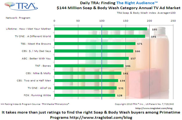 While many networks have decided to go with more original comedy series, there is still a paucity of great comedies, which makes it hard for advertisers who want their brand to be associated with such light-hearted, family fare to find the right environment on television for their creatives. Among the programs of this genre that air during prime time, some have The Right Audience™ for Soap and Body Wash brand advertisers who seek the light hearted environment. The best comedy programs for reaching Soap and Body Wash Purchasers include several comedies that air during primetime on cable networks, and there were some broadcast network comedies that made it into the top 10 as well. Three comedies that premiered this 2010-2011 television season, CBS's Bleep My Dad Says, ABC's Better With You, and Fox's Running Wilde are among them. These powerful "Right Audience" metrics give advertisers and networks the last laugh as they improve ROI for the brand, while increasing revenue for the network.
