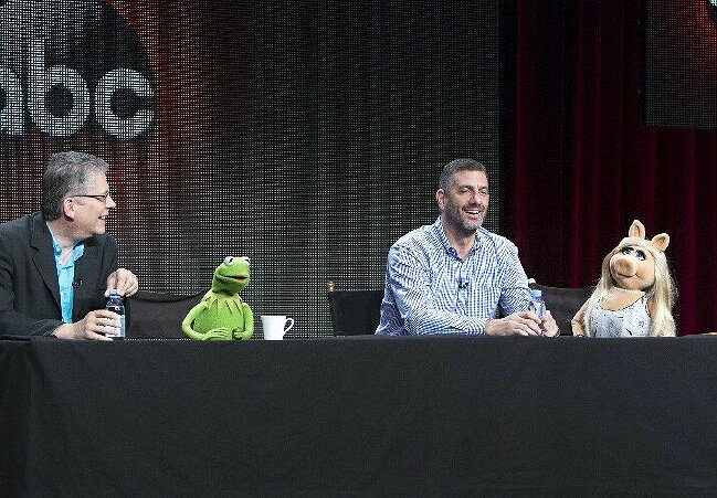 It was obvious back in May during the broadcast networks’ Upfront week that ABC had the most talked about new series of the fall with its updated version/franchise continuation of that multi-generational modern classic “The Muppet Show,” now known as “The Muppets.” Advertisers and the press instantly embraced the return of such iconic characters as Kermit, Miss Piggy, Elmo and many others. The excitement continued yesterday during the first of ABC’s two days at the Summer 2015 Television Critics Association tour, which began with a press conference featuring Kermit and Miss Piggy (pictured at top with “Muppets” executive producers Bill Brady, left, and Bob Kushell) – during which one of America’s favorite celebrity couples confirmed that they are calling it quits. Like almost everything else these days, the announcement rocked social media, galvanizing Facebook and causing Twitter to once again blow up.