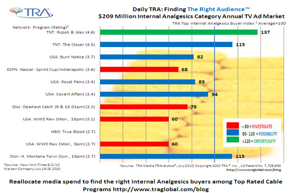 Spending $208 million on television advertising a year, it may be cause for a headache to the Internal Analgesic brand managers to learn that only the top Cable rated TNT “Rizzoli & Isles” is delivering an audience that purchases a lot of their brands – 37% more than average. There are many wasted dollars when media is bought based on ratings alone. Shifting to buying television based on where to find actual buyers might be the best medicine!