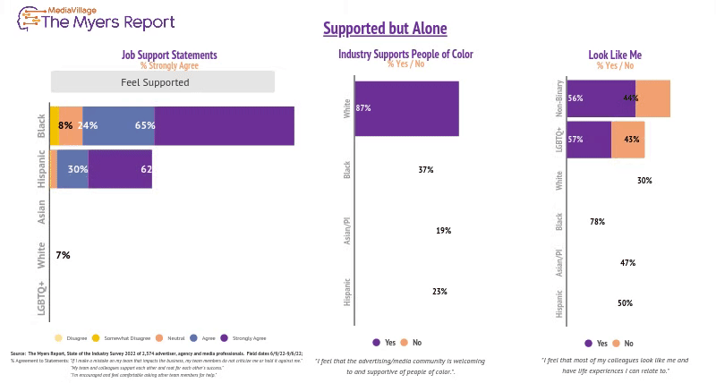 To be fair, among multiple metrics, Black industry professionals outscored their colleagues in areas such as "feeling supported," "asking for help" or "being comfortable making mistakes." That said, there is an out-sized discomfort when it comes to working with confidence and having a sense of inclusion. While nearly two-thirds of Black respondents believe that the industry supports People of Color (63.4%), less than a quarter (22.5%) felt they worked in an environment with colleagues who "look like me" -- a figure that significantly trailed the LGBTQ+ community (57%), Non-Binary community (56%), Asians (53%) and Hispanics (50%).