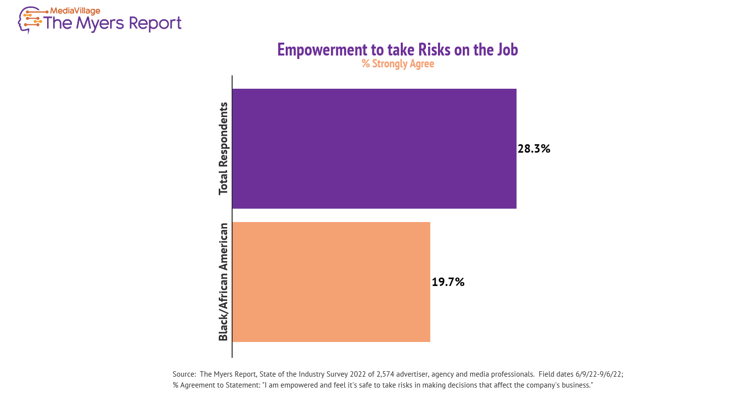 On screen and in cultural products, the NAACP recently acknowledged in April 2021 that our industry has made significant progress in advancing the representation of diverse groups with more Black and African American characters in leading or featured roles. Behind-the-scenes, however, their voices remain noticeably under-represented or un-empowered to make critical decisions about how or if their culture is portrayed. The Myers study unearthed evidence that corroborated this as well. When asked if they felt empowered and safe to take risks in making decisions that affect their company's business, only 19.7% of Black respondents strongly agreed versus 28.3% across the entire study.