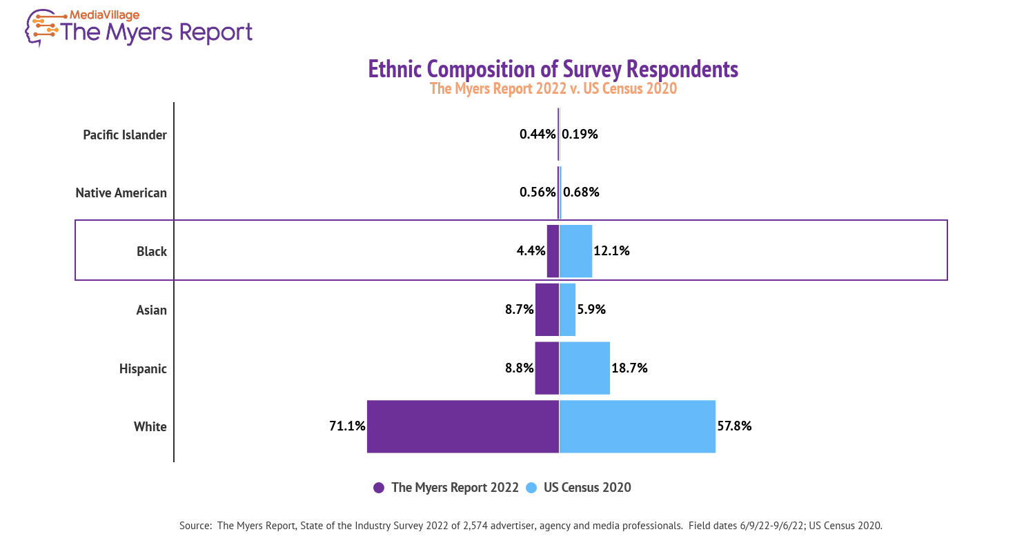 In the summer of 2022, The Myers Report conducted a survey of 2,574 advertiser, agency and media professionals and found that only 4.4% identified as Black or African American. At one-third the projected size of the U.S. Black/Non-Hispanic population (12.1% according to the most recent 2020 Census), the ad industry still has much work to do in attracting and engaging this important demographic group. As recently as 2020 (pre-pandemic), The Myers Report had similar findings with 4.9% of the industry identified as Black or African American women and 1.6% as Black or African American men. Even the Association for National Advertisers (ANA), which primarily monitors progress in this area among marketers, reported in the fall of 2021 that 6.6% of professionals in their member companies identified as African American or Black -- roughly half of their presence in the general population.
