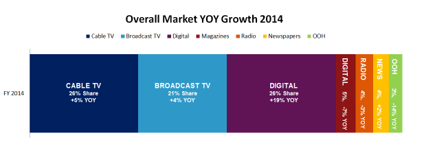 SMI saw television continue to feature prominently in the media strategies of the major agencies, commanding 58% of all advertising dollars. Broadcast spend grew 4% from 2013 and cable increased 5%. The bulk of the growth occurred during the first few months of 2014 before television spending retreated in the second half of the year. We saw advertisers tread cautiously when it came to upfront investment, waiting to see how consumer confidence netted out in the latter part of the year in order to leverage better deals in the scatter market. The knock-on effect of this approach pushed upfront dollars down 8% in Q4 and saw the scatter market do its best to make up the difference surging along with a considerable 29% increase.