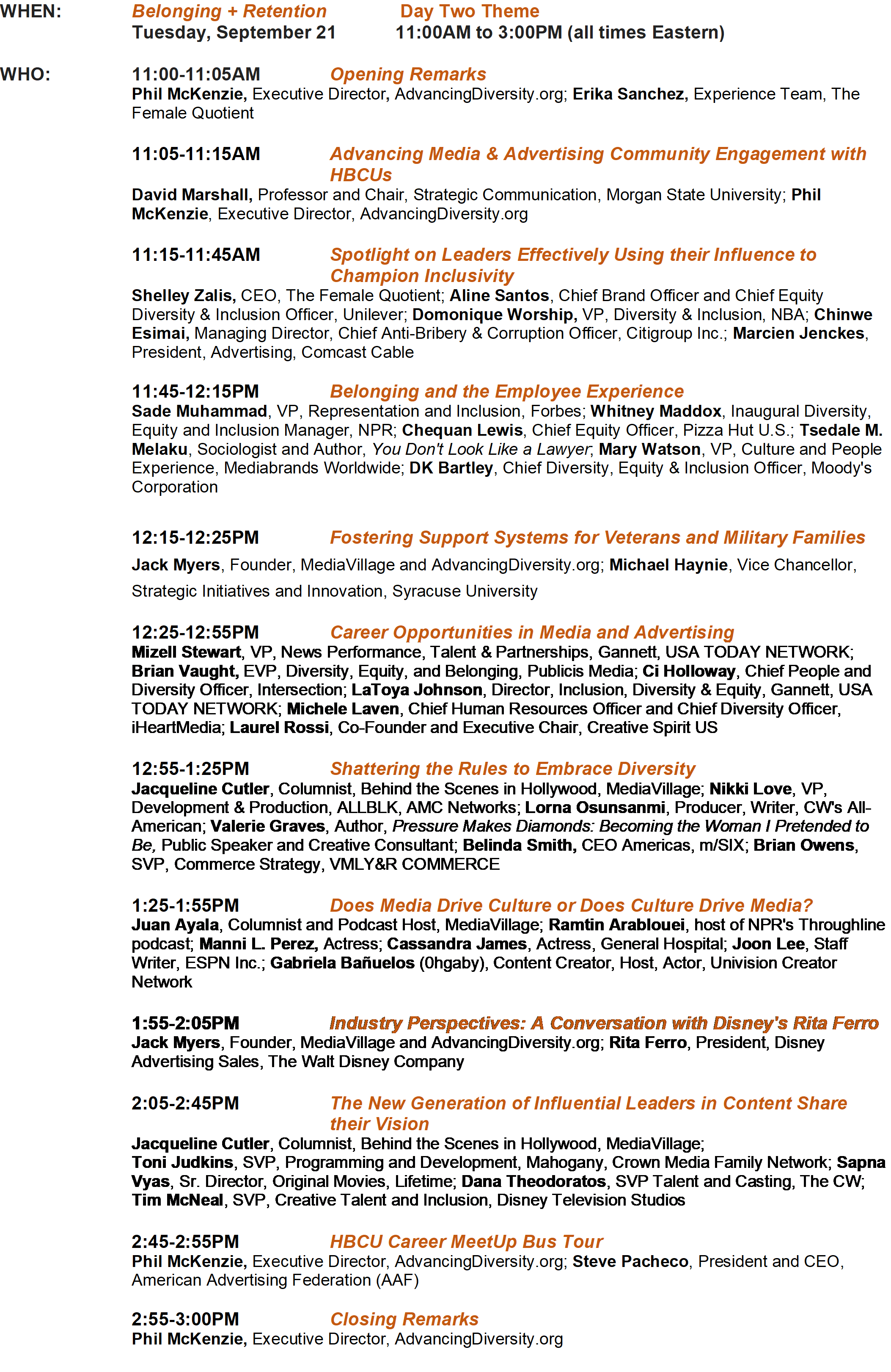 Advancing Diversity Week's series of keynote addresses and provocative panel discussions hosted by MediaVillage.com, AdvancingDiversity.org and The Female Quotient (The FQ) features: D-E-I + Belonging! on Monday, September 20; Belonging + Retention on Tuesday, September 21, and Multicultural + Meaning on Wednesday, September 22. For the complete agenda of 80-plusAdvancing Diversity Week speakers, go to https://week.advancingdiversity.org.