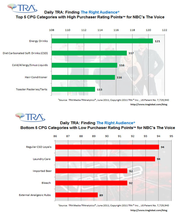 NBC’s new show, The Voice, brings together world renowned singers Christina Aguilera, Blake Shelton, Adam Levine and Cee Lo Green in search of the next big star in the world of music. At the end of season 1, The Voice, is considered a resounding hit, not only for the network NBC and Javier Colon, the winner but also for singers Aguilera and Shelton. Advertisers of Energy Drinks, Diet Carbonated Soft Drinks, Hair Conditioner and Toaster Pastries/Tarts could also make their media plans a hit by advertising in Season 2 based on using TRA’s Media TRAnalytics®. In the charts below, StoryFinder™ offers a brief glimpse into the top and bottom five categories in terms of Purchaser Rating Points™(PRPs) for . Advertisers are using PRPs to fuel their media plans and eliminate waste and make smarter Television planning and buying decisions. To learn more about TRA, please visit www.traglobal.com.