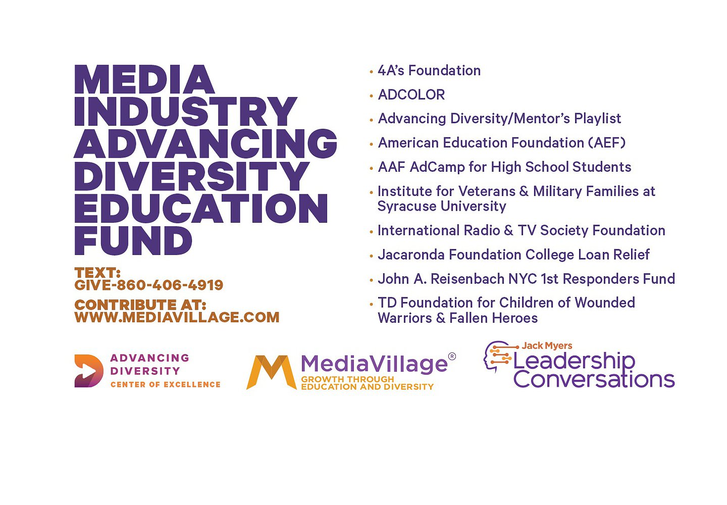Please support the Media Industry Advertising Diversity Education Fund to assure that the organizations we depend can continue to serve our industry, our friends, and our colleagues. SCROLL DOWN TO DONATE OR TEXT GIVE to 860.406.4919