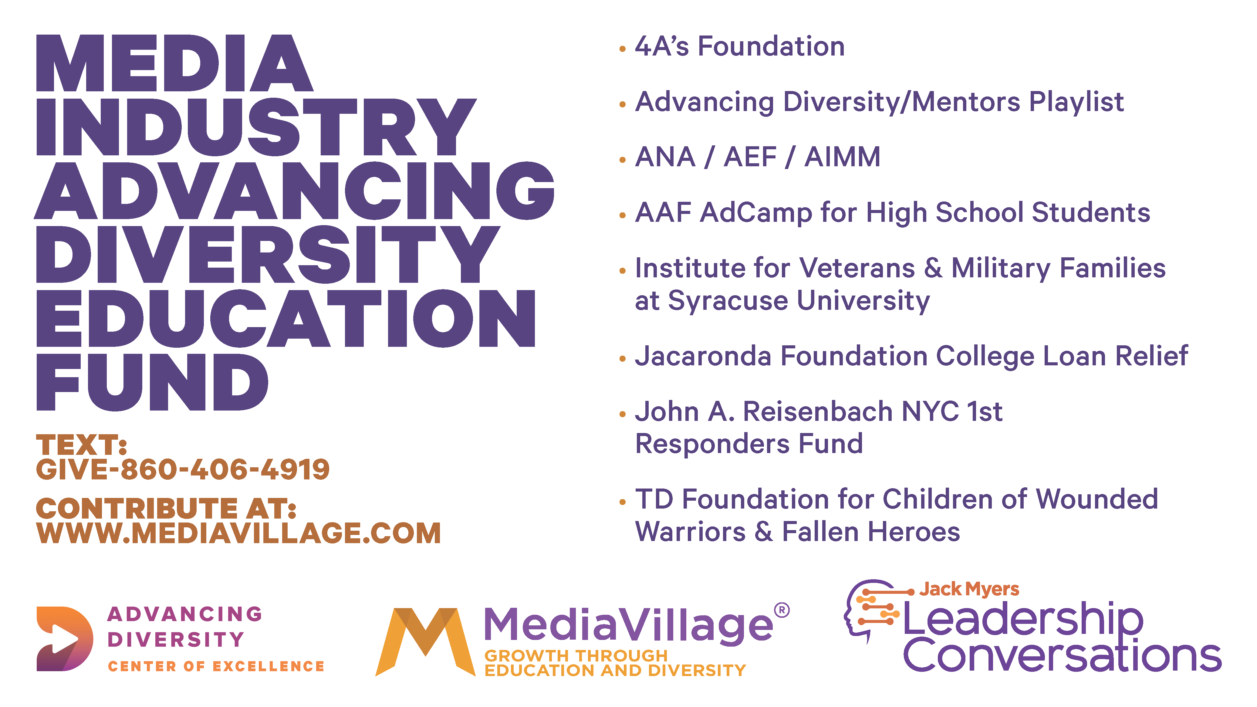 Please support the Media Industry Advertising Diversity Education Fund to assure that the organizations we depend can continue to serve our industry, our friends, and our colleagues. SCROLL DOWN TO DONATE OR TEXT GIVE to 860.406.4919