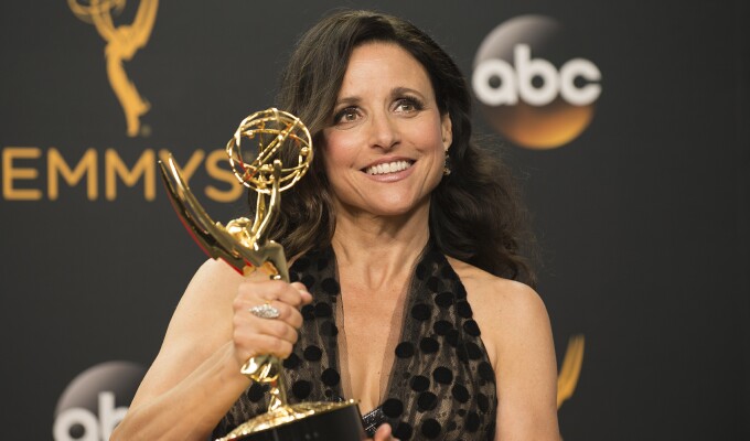 The night also had two moments of genuine emotion, as tearful first-time winner Kate McKinnon of NBC’s Saturday Night Live – as surprised as the rest of us by her very deserved win – accepted the award for Outstanding Supporting Actress in a Comedy Series and, later, a visibly shaken Julia Louis-Dreyfus (pictured below) of HBO’s Veep accepted her fifth consecutive win for Outstanding Lead Actress in a Comedy Series, ending her acceptance speech with the revelation that her beloved father has passed away just two days earlier.