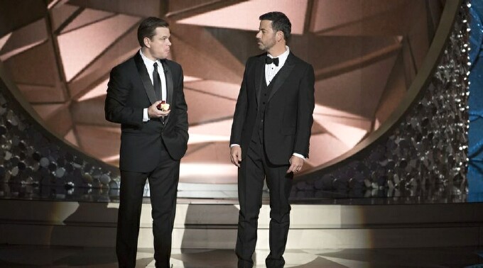 Kimmel’s pre-taped opening bit went from consistently clever and funny to downright shocking (in a good way) with a surprise and surprisingly hilarious cameo by former presidential nominee Jeb Bush (insert exclamation point here). The delivery of food (in this instance peanut butter sandwiches) to famished stars in the audience (an award-show bit that is thisclose to becoming stale) worked as well as it did because the young stars of Netflix’s summer sensation Stranger Things were leading the delivery team. Matt Damon’s appearance (pictured below) as Kimmel’s Hollywood nemesis – an ongoing bit dating back to the beginning of Jimmy Kimmel Live – also worked, even in subtle ways, like Damon’s remark about “these apples,” a reference to the infamous JKL video I’m F—king Matt Damon.