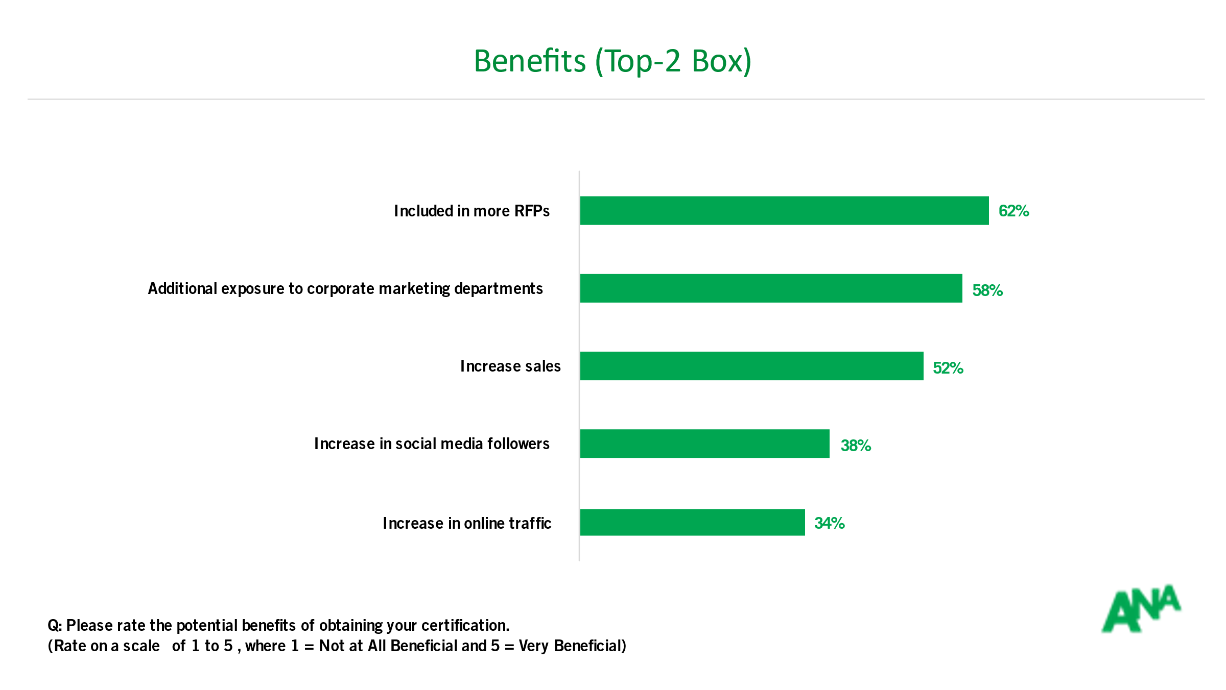 The diverse suppliers cited multiple benefits of obtaining certification. Businesses are included in more RFPs (62 percent), which provides additional exposure to corporate marketing departments (58%), which leads to increased sales (52 percent).