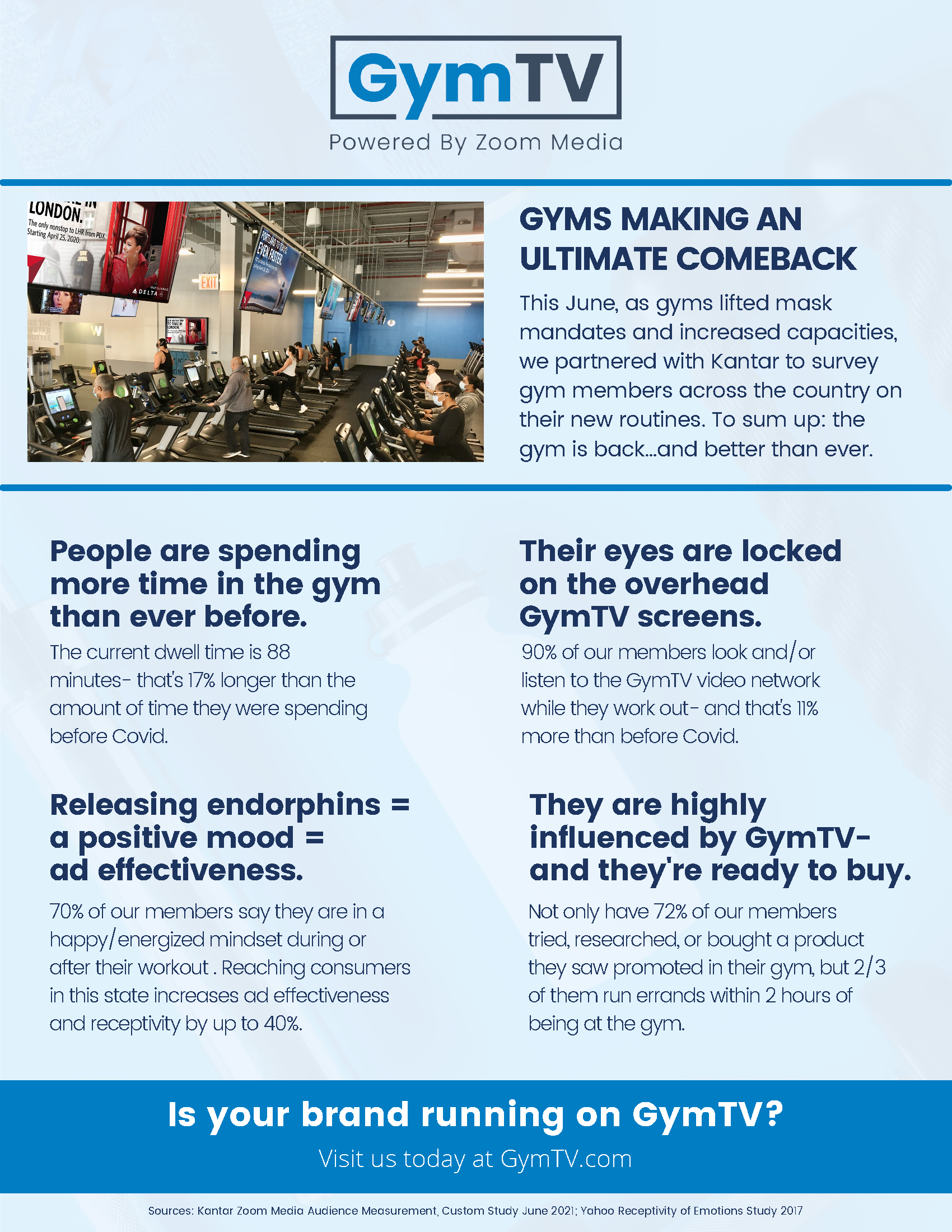 How can a company that owns the leading gym TV screen system grow during a global pandemic? Hard work, research and a positive attitude helped Zoom Media's GymTV have one of its best years yet. Thanks to a new study done with Kantar, they're now more in tune with their audience and better able to deliver greater intelligence to clients that in turn provides ideas for new and deeper engagement. Anne Fiedel, Senior Director of Strategy & Marketing at Zoom Media, explains.