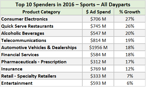 Now let's take a look at advertiser categories that doubled down on sports. As you'll see below, the top 10 spending categories by volume all increased their sports buys.