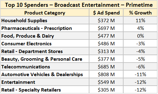 In contrast, only two of the top 10 categories by volume increased their commitment to primetime broadcast television and the others were down in terms of ad volume and % change, highlighting the fact that this important revenue flow from big advertisers is steadily shrinking.