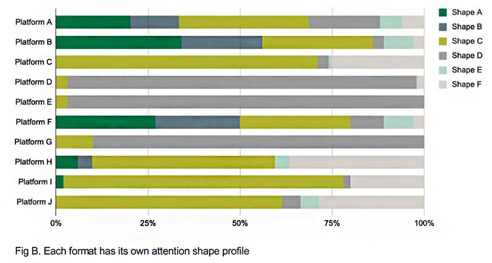 When we removed scrollable formats to focus on TV and cinema environments, four distinct viewing patterns emerged (featured as the top four on the list above). Each ad view was assigned a ‘shape of attention’ profile, and the relationship between the shape and brand outcomes was considered. From here, each shape of attention was classified as having high, medium or low likelihood to drive STAS.