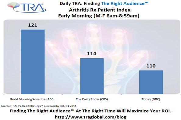 With TRA’s TV Health-Ratings™ powered by SDI, advertisers can now leverage single-source intelligence combining viewing and actual prescription behavior to help pinpoint which networks, dayparts and programs across broadcast and cable will be most efficient to reach Arthritis patients.