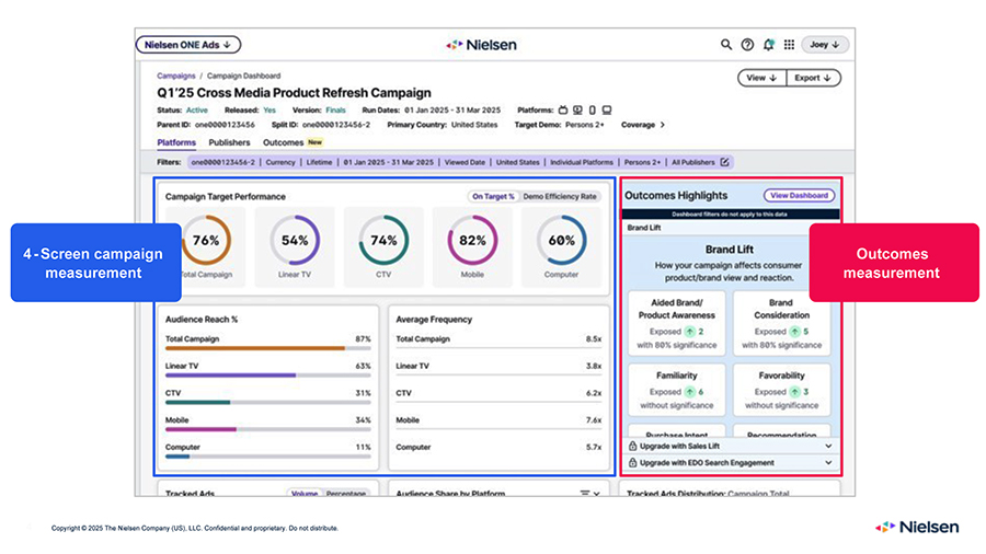 Pete Doe, Chief Research Officer, and Shweta Shah, Vice President of Data Science at Nielsen, co-presented Nielsen’s approach to outcome measurement, which uses AI and a synthesis of proven methods to provide a holistic perspective via an all-inclusive dashboard. As you can see, reach and frequency by media types across TV and digital are shown side by side with full funnel outcome measures of branding and sales.