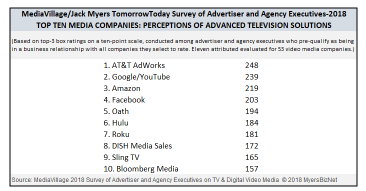 AT&T AdWorks ranks first among 53 media companies for providing advertisers and agencies with advanced television solutions, and follows only Google/YouTube, Amazon and Facebook (GAF) for providing advanced market research, data resources, and analytics that support marketers' and agencies' media decision making. Verizon's Oath (AOL and Yahoo) ranks closely behind the leaders in both categories. The companies are perceived as superior to the TV networks in delivering advanced data and technology. (Scroll down for the chart) Data from the new Jack Myers TomorrowToday study among 750 advertiser and agency executives conducted for MediaVillagepositions AT&T and Verizon at the intersection of opportunity and risk.