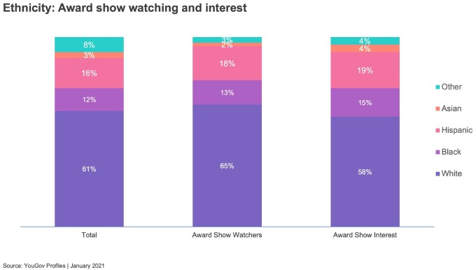 As awards shows and the larger entertainment industry work to increase diverse representation, perhaps more of this interest can be converted to viewership. Awards show watchers skew slightly more White than total U.S. adults, which is expected given their older age. However, people interested in awards shows are just as diverse -- arguably slightly more diverse -- than the racial makeup of the U.S. population.