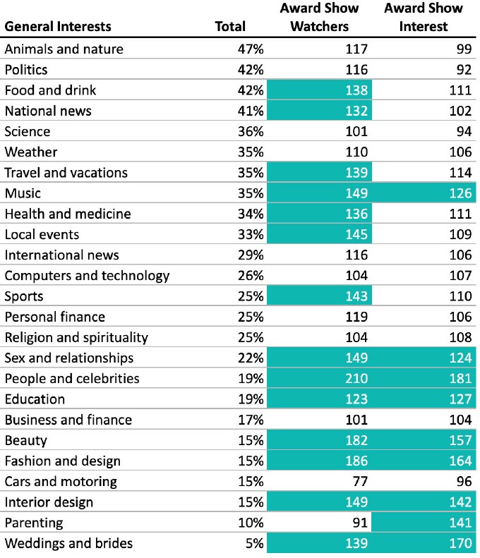 Data suggests that the broader appeal of awards shows is with an audience possessing a general appreciation for creativity and self-expression. Awards show watchers and those interested in awards shows are almost twice as interested in People & Celebrities versus the general population, and they are also more interested in topics such as Music, Beauty, Fashion & Design, and Interior Design. Their predisposition to these topics is likely what leads them to be interested in and watchers of awards shows in the first place.