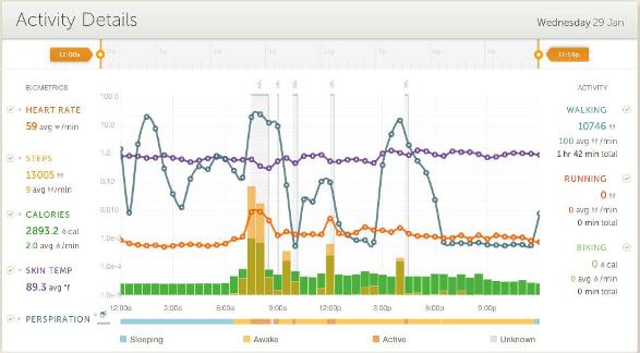 If you decide to use the smartphone app or sync the Basis B1 with your computer, you'll get additional data about perspiration, and skin temperature (which is information, not knowledge – so it will be noise for most people). The band can take a pretty good guess about whether you are walking, running or biking, so the website displays additional data about averages and total minutes you engage in those activities. This is additional non-actionable information, unless you are relying solely on the Basis B1 to track your runs or walks (a purpose for which its included software was not designed).