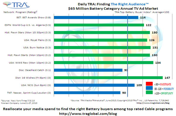 We know that a battery is a device that converts chemical energy into electrical energy. Batteries have two electrodes, an anode (the positive end) and a cathode (the negative end). More interesting to those of you reading this post is the following: Do people who buy batteries (are we all techies now?) watch the kind of television shows we would expect? Well, 7 of the top 11 rated Cable programs (there was a tie for 10th place) offer the Battery advertisers, like Duracell and Energizer, both high ratings and a great audience of people who buy a lot of Batteries.