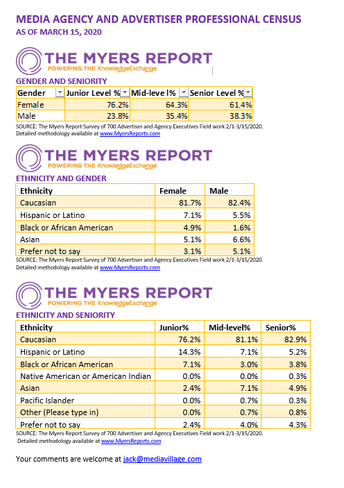 This topic is covered extensively in the data charts below and at AdvancingDiversity.org – The Black/White Divide. At all levels of management below CEO, females are well-represented in the media community. As noted in The Myers Report data charts below, males constitute 35% of media agency professionals and fewer than 25% of junior media agency personnel. Only 1.6% -- that's not a typographical error – of males in the media agency business and 5.0% of females are Black. Seventeen percent of females and 13.7% of males are ethnically diverse.