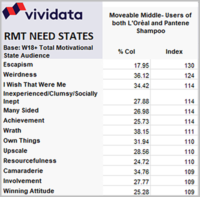 Notice that there are 2.1 million consumers who switch back and forth between L’Oreal and Pantene, or use them both all the time. They are the Moveable Middle for each of the two brands. They might be a sensible strategic target for both brands. Who are they and what are their motivations? What media reach them, these consumers in the middle? Vividata supplies these answers, with the motivation data coming from RMT. The RMT system has been proven able to extract motivations from media content consumption behavior, and to turn this into creative and media tactics which increase incremental sales and long-term brand love.
