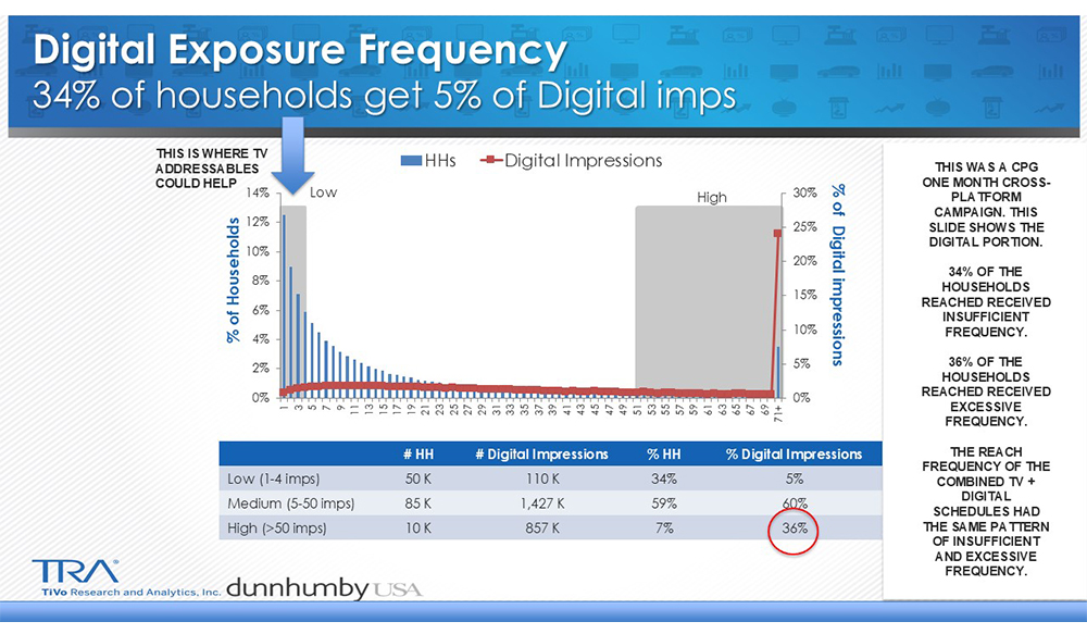 And let’s not forget insufficient frequency, it is as big a problem as excess frequency. In any typical campaign using digital + TV, about 70% of the people reached are getting either too little or too much frequency.This is illustrated in these two slides: