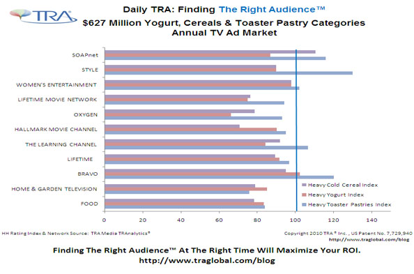 As an example, when comparing female oriented Cable Networks that typically sell their inventory to the surrogate Women 25-54 traditional target to the composition of those same networks among actual buyers for three breakfast food categories – Cold Cereal; Toaster Pastries and Yogurt, there were some Networks with opportunities as well as likely wasted spend with regard to finding “The Right Audience™”.