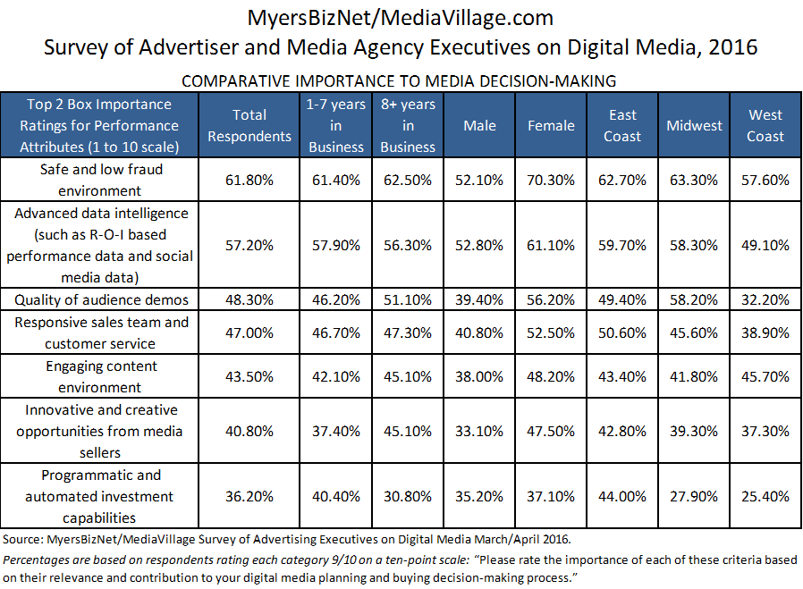 Among female decision-makers, 70% consider a safe and low fraud environment for advertising to be extremely important to their decision-making process in the selection of media placement partners (9/10 on a 10-point scale). Only 52% of male respondents rate the category at the same degree of importance. A similar male/female disconnect occurs in six of the seven categories measured. Only the comparative importance of programmatic and automated investment capabilities, which ranks last among the seven categories, is rated at the same degree of importance.