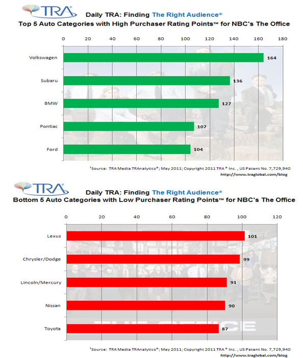 Fortunately, TRA’s Media TRAnalytics® can help, going beyond Plain Old Ordinary Rating Points to provide targeting insights to help improve an advertiser’s ROI. Foreign car manufacturers, for example, might be interested to know that households that own some foreign cars – namely, Volkswagens, Subarus or BMWs – view The Office in greater numbers. The Office’s rating among Volkswagen owners is 64% higher than the programs overall rating (index of 164); Subaru owners index at 136 and BMW at 127.