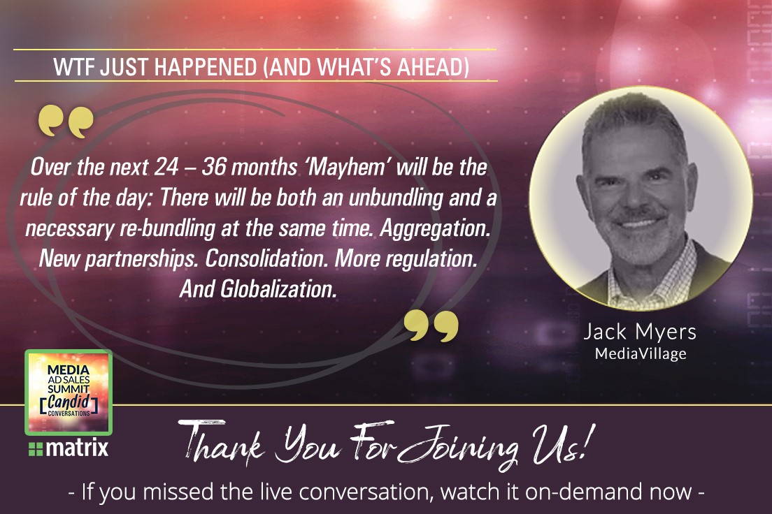 Jack Myers, media ecologist and founder of MediaVillage and AdvancingDiversity.org has been a witness to media technology advances since the introduction of FM radio and built his career forecasting how technology would impact on brand marketing and ad spending decisions. CRO of Matrix Solutions, Brenda Hetrick hosted a Candid Conversation with Myers in what was billed as "WTF Just Happened (And What's Ahead)" that proved to be more candid than Hetrick may have anticipated..