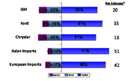 Among the domestics, Ford stands out as a head above the rest. Ford's net advocacy score is +33, compared to +20 for GM and +16 for Chrysler. Further, Ford's net advocacy score showed steady signs of improvement through the year to date, meaning that the quality of its "buzz" is improving and that Ford is beginning to bridge the gap between where the rest of the domestic brands stand with regard to WOM, and the Asian brands.