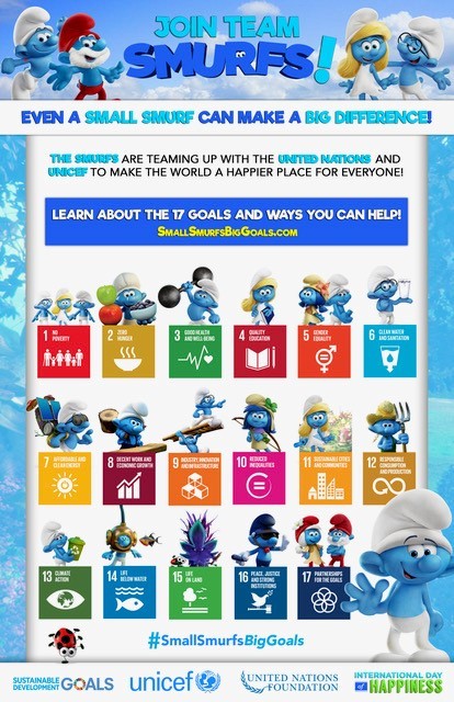 The campaign, co-created by the UN, the UN Foundation, UNICEF and Sony Pictures Entertainment, utilized The Smurfs, animated characters that young people have deep ties to and are interested in engaging with, to focus on global mass market engagement of Gen Z'ers. Building off the SDGs, this campaign developed outreach strategies that tapped the Smurf brand's creative resources, capitalized on their existing multi-million-dollar marketing plans and access to global distribution to reach new potential supporters around the world with important messages.